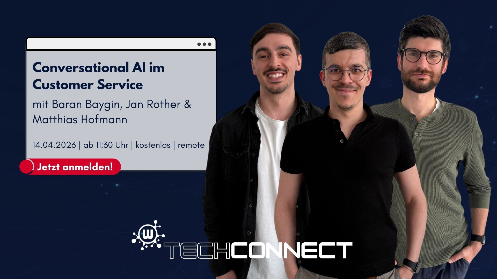 In unserem nächsten TechConnectTalk zum Thema „Conversational AI im Customer Service: Was geht, was nicht – und warum.“ zeigen Jan Rother, Baran Baygin und Matthias Hofmann aus der Witt-Gruppe, wie sie einen Voicebot für den Customer Service aufgebaut haben und welchen technischen Hürden sie dabei begegnet sind. Sei dabei, freue dich auf Beispiele direkt aus der Praxis und starte in die Diskussion.