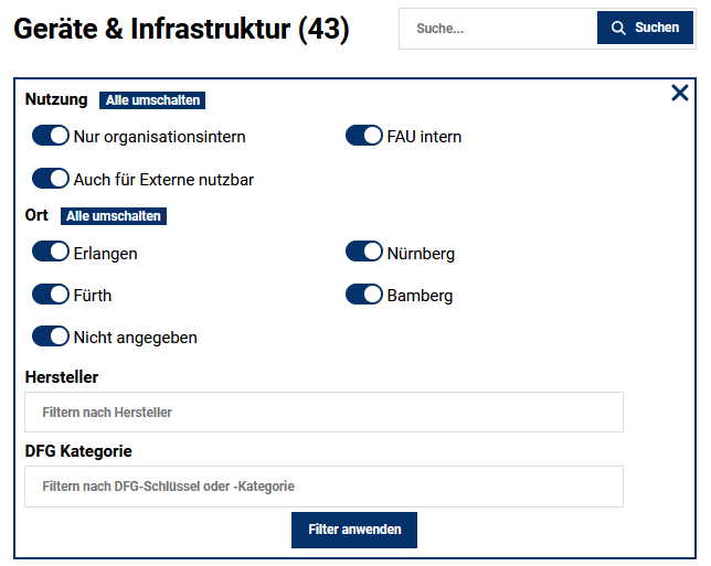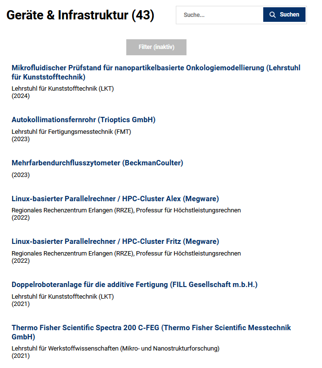Für die einzelnen Geräte können in der internen Oberfläche von CRIS zusätzliche Information wie Nutzung in Drittmittelprojekten, Publikationen und Forschungsbereichen hinterlegt werden, ebenso Angaben zu Hersteller, Fördergeber und andere Zusatzinformationen. Diese werden auch im Forschungsportal ausgegeben: