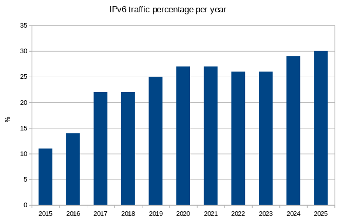 The percentage of IPv6 traffic increased marginally to 30% (3.02 PiB), after 29% in 2024, 26% in 2023, 26% in 2022, 27% in 2021, 27% in 2020, 25% in 2019, 22% in 2018, 22% in 2017, 14% in 2016 and 11% in 2015.