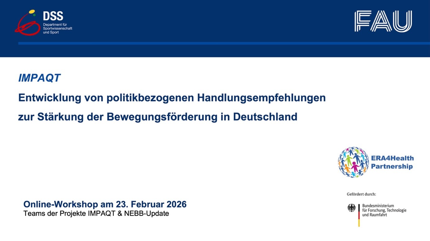Im Anschluss an den Workshop startete eine Online-Umfrage, in der der aktuelle Stand der Bewegungsförderung in Deutschland bewertet sowie weitere Handlungsempfehlungen gesammelt werden (Link). Die vorgeschlagenen Handlungsempfehlungen werden anschließend durch die beteiligten Stakeholder priorisiert. Weitere Informationen zum IMPAQT-Projekt finden Sie hier.
