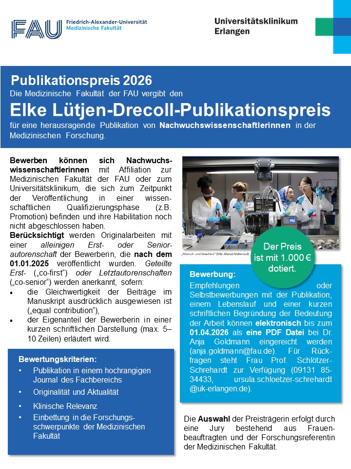 Die Medizinische Fakultät der FAU vergibt den Elke Lütjen-Drecoll-Publikationspreis für eine herausragende Publikation von Nachwuchswissenschaftlerinnen in der Medizinischen Forschung.